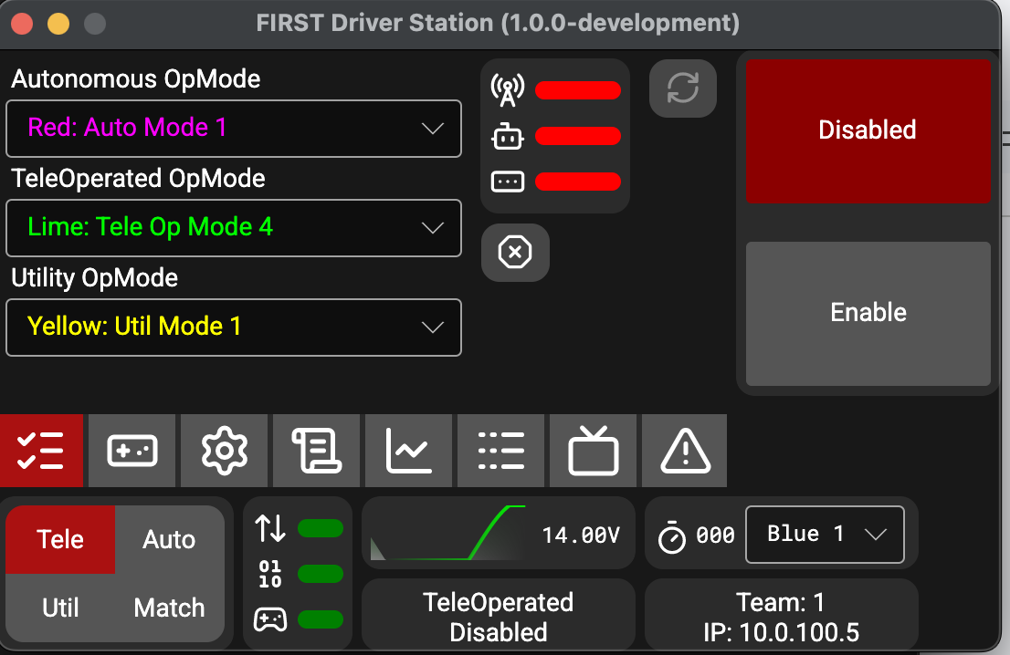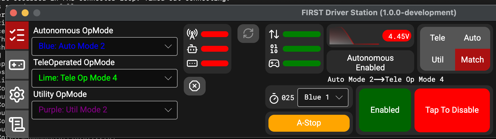 Autonomous, Teleoperated and Utility modes are supported similarly to the existing FRC DS, with the addition of allowing selecting an op mode to run. Practice Mode has been renamed to Match Mode. This mode is to allow FTC teams to run their robots in matches without an FMS. An A-Stop button exists during autonomous to allow teams to start their autonomous but keep timing for moving to Teleoperated mode.